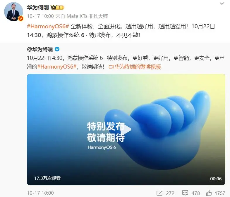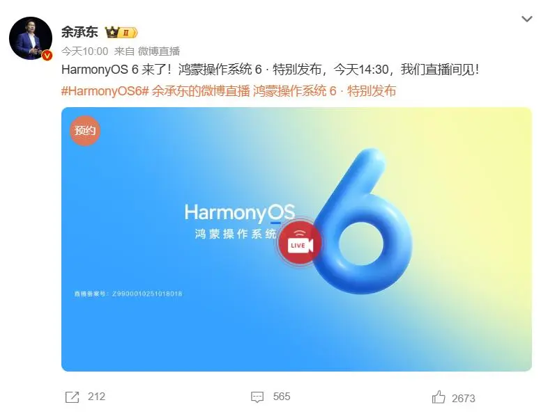 华为常务董事、终端BG董事长余承东也在发布会当天10点又发文预告:HarmonyOS 6 来了!鸿蒙操作系统 6 · 特别发布顺升网,今天14:30,我们直播间见!