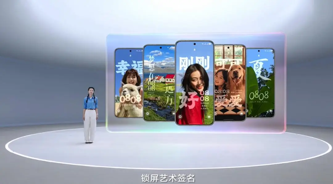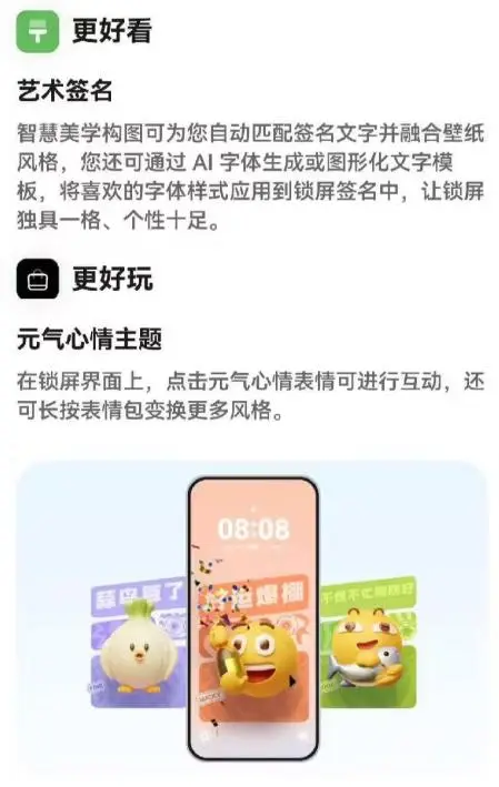 还有许多好玩的功能升级,元气心情、艺术签名。在锁屏界面上,点击元气心情表情可进行互动,还可长按表情包变换更多风格。智慧美学构图可自动匹配签名文字并融合壁纸风格,还可通过 AI字体生成或图形化文字模板,将喜欢的字体样式应用到锁屏签名中。