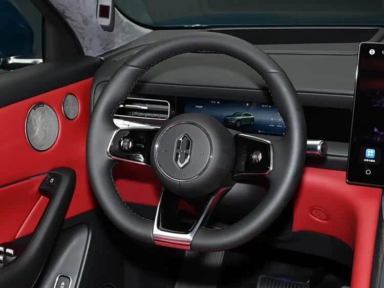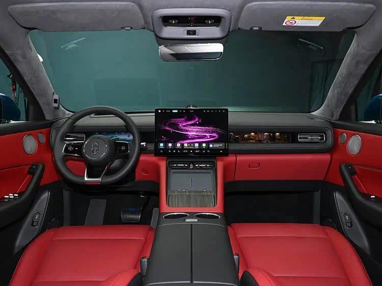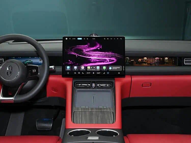 进入车内,能够感受到在材质和色彩搭配上花了心思。内饰提供了多种双色搭配方案,并在细节处辅以木质饰板进行点缀,试图提升座舱的质感。中控台最引人注目的是由多块屏幕组成的交互区域:包括一块可左右调节角度的中央大尺寸触控屏、一块专为副驾驶设计的娱乐屏以及传统的仪表屏。此外,车辆还配备了抬头显示系统,将关键行车信息投影在前风挡上。